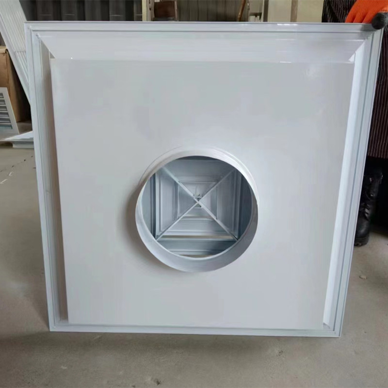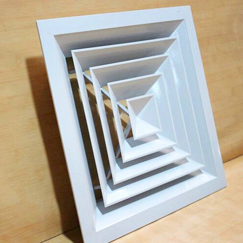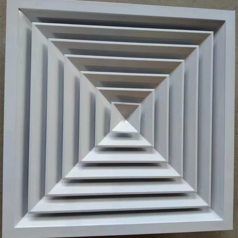 方形散流器线条挺直,表面光洁,叶片角度为固定式,叶片采用夹角片冲压连接,整个叶片与边框采用分离式结构,以方便安装与调节。设计时可根据房间造型不同,选用不同出风方向散流器,可与调节阀配套使用。方形散流器有四种气流吹出形式,分别为一面吹(A1S0)、二面吹(A2S0)、三面吹 (A3S0)、四面吹(A4S0) 。铝合金表面经阳极氧化处理,也可根据用户要求进行静电喷塑。